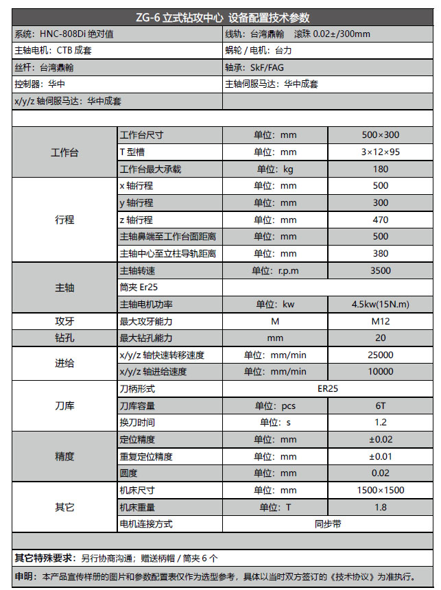 一ZG系列立式钻攻中心,独特的Z轴悬臂端头自动6把刀刀库,换刀速度更快。整机采用模块化设计,零部件运用三维软件设计、进行了有限元力学分析。主要部份为箱型多筋结构、树脂砂高牌号精蜜铸件。铸件经退火、时效粗加工后二次回火处理,在精加工、精磨制成。选用了知名品牌直线导轨、滚珠丝杆及预紧螺母、直联高速主轴单元、优质联轴器、可靠的润滑、防护、机械系统、数控系统、气源、冷却、排屑装置,性能稳定可靠,精度高、速度快、完全媲美类似机型,已大批量装备放心使用。本机型广泛应用于汽配、摩配、电子、航空航天、高铁动车、碳制品、五金、机械产品、石化、液化燃具等行业零配件钻孔、攻牙、铣削、镗削、雕刻等加工,可与专用工装夹具、四轴转台四轴桥板、五轴转台配合使用。